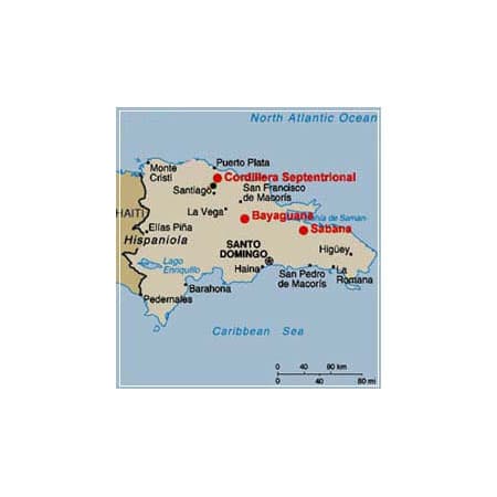 Wschodnia część Wyspy Hispaniola w granicach Republiki Dominikańskiej od dawna znana jest z pięknej żywicy kopalnej ukrytej w jej łańcuchach górskich La Cordillera Septentrional oraz Cordillera Orieltal. Bursztyn ten nie jest łatwo dostępny, ponieważ bryłki trzeba wydobywać z twardego piaskowca na stromych zboczach górskich, a nie z luźnych utworów osadowych, jak w przypadku sukcynitu z Europy Środkowej. Nie ma tu kopalni na skalę przemysłową, lecz mocno rozrzucone pojedyncze szyby, rowy i sztolnie wykopane ręcznie za pomocą kilofów i dłut. Sztolnie te mają często postać długich i wąskich tuneli wykopanych poziomo do wnętrza gór, o długości sięgającej aż 70 metrów.