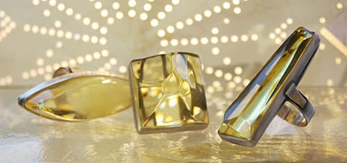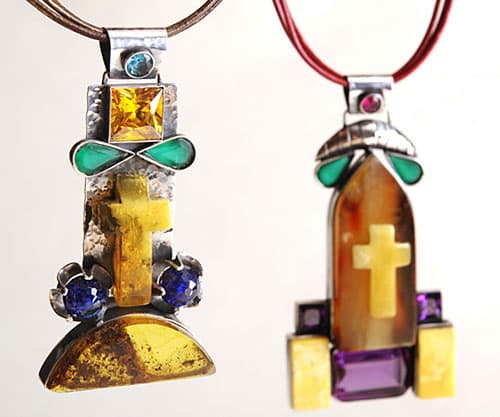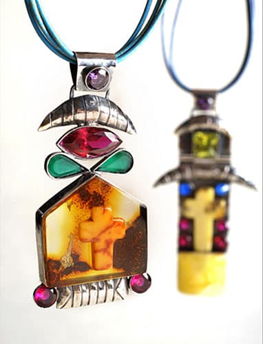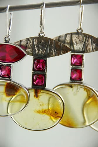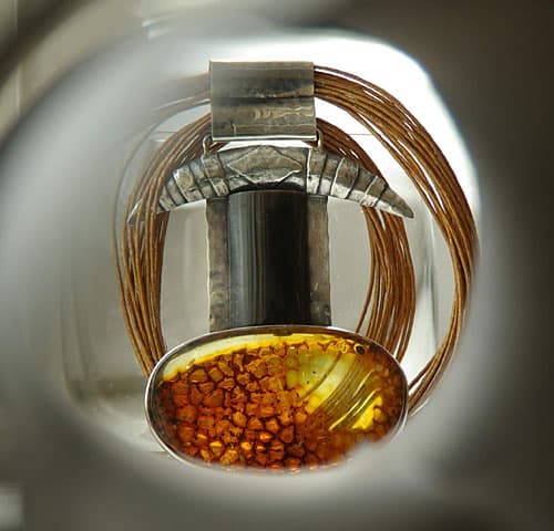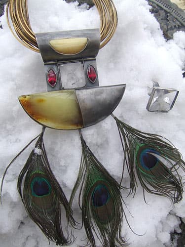 I takie też są jej najnowsze prace: naszyjniki, broszki, kolczyki i bransoletki, które będą miały swą premierę na targach Amberif 2010, z całą pewnością zachwycą wszystkich wielbicieli fantazyjnych, przykuwających uwagę form. Tym razem znajdziemy srebro i bursztyn w szalonych zestawieniach z soczyście kolorowymi kamieniami naturalnymi i syntetycznymi oraz barwnymi piórami, w tym także... pawimi. Dużo tego, ale trzeba przyznać, że to balansowanie na granicy kiczu jest absolutnie pociągające!