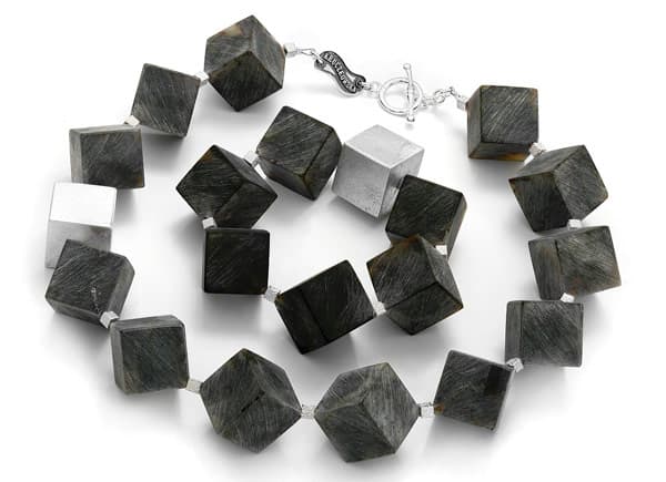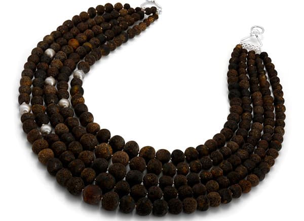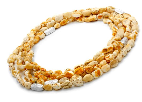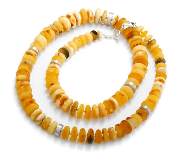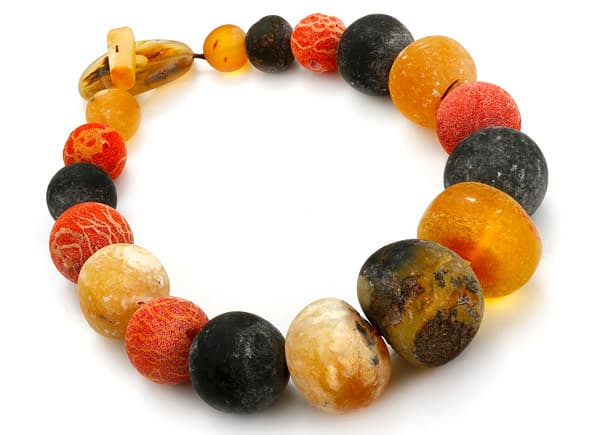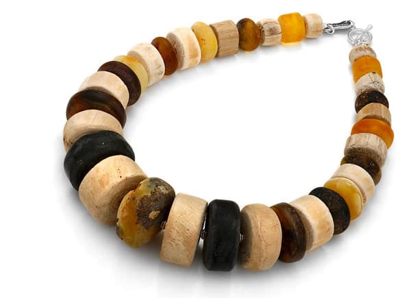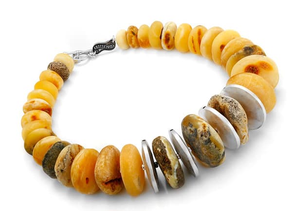 Podstawą kolekcji jest oczywiście bursztyn: pozostawiony w naturalnej formie, pięknie matowiony oraz w postaci tzw. żużlu. Ten matowiony przypomina „upudrowane” landrynki – to specjalność pani Danuty już od ośmiu lat, choć, jak sama przyznała, dopiero w tym roku został on „zauważony”. Bogata gama odcieni bursztynu została specjalnie dobrana i skomponowana z wypolerowanymi przez morze patykami oraz elementami zdobniczymi wykonanymi ze srebra. Na szczególną uwagę zasługują zapięcia wykonane z bursztynu bez użycia metalu. „Pokazałam prawdziwy bursztyn, który widać i można nosić” – podsumowała projektantka.
