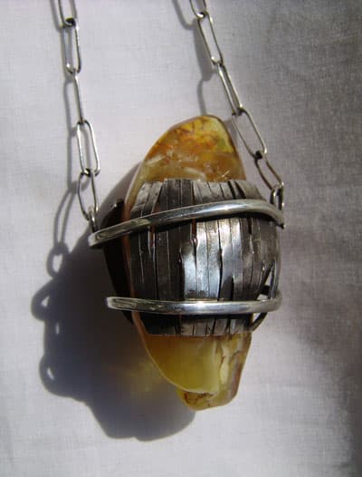 ”Bursztyn jest fantastyczny, to złoty kamień. Delikatna choć skamieniała żywica. Jego kolor jest obsesyjnie piękny. Niewiele dotychczas pracowałem z bursztynem, ale zawsze zależało mi przede wszystkim na zachowaniu jego charakteru. Oczywiście możliwe jest szlifowanie podobnie jak innych kamieni, ale moim zdaniem jest to równoznaczne z zadawaniem gwałtu naturze bursztynu. Dla mnie bardzo ważne jest zachowanie powierzchni kamienia przy jednoczesnym umożliwieniu wglądu w jego ciekawe wnętrze. Uważam, że trzeba za wszelką cenę zachować unikatowy charakter bursztynu i absolutnie nie wolno go ‘uniformizować’”.